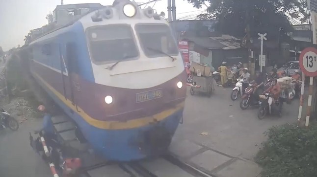 The biker was shown on CCTV footage being clipped by the passing locomotive as he crossed the railway in Hanoi, Vietnam.