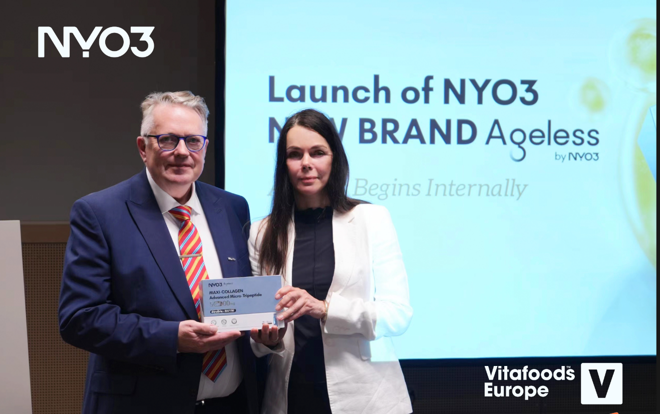 On 15th May in Geneva, Switzerland, NYO3 successfully hosted the 2024 NYO3 Global Anti-Aging Brand Launch Event at Vitafoods Europe and officially established a strategic partnership with the renowned Norwegian anti-aging research center, NO-Age. They introduced the new premium anti-aging brand, ‘Ageless’, and launched their first product, NYO3 Ageless MAXI-COLLAGEN Advanced Micro-Tripeptide, marking a new era in anti-aging solutions.